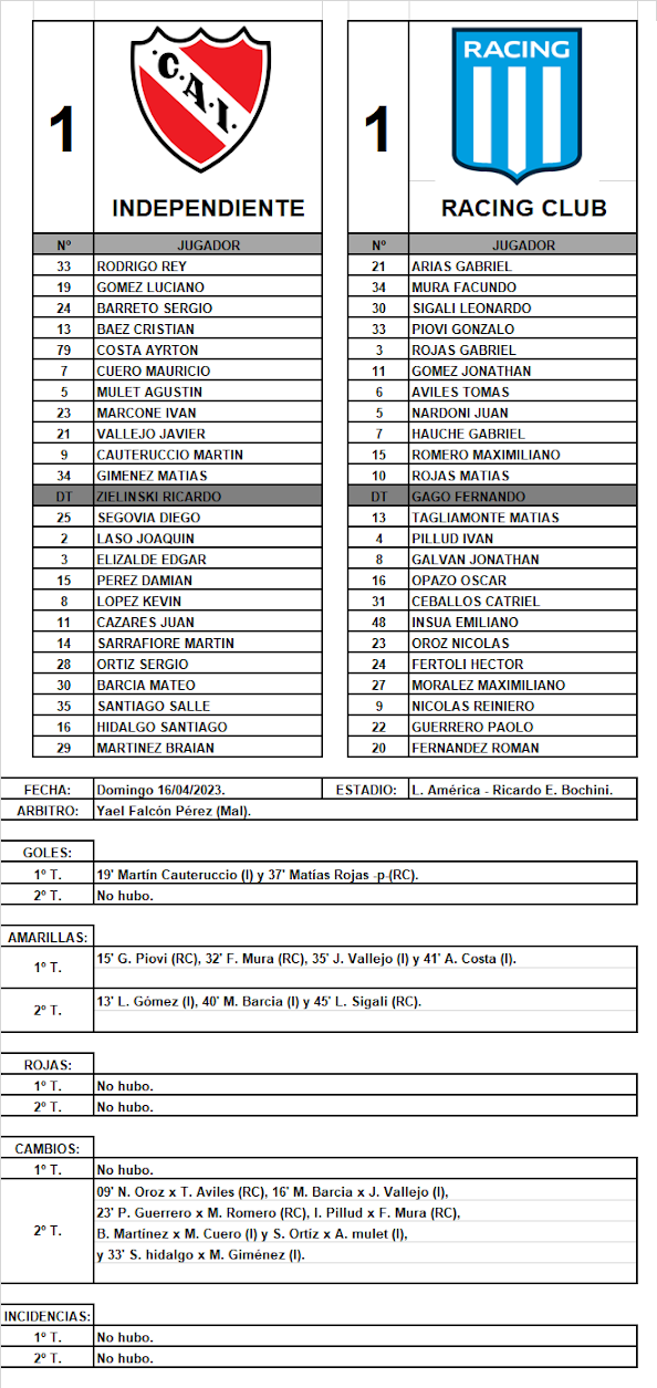 En el Estadio Libertadores de América - Ricardo Enrique Bochini, Independiente igualo 1 a 1 frente a Racing Club con un arbitraje muy perjudicial del HDP Yael Falcón Pérez, quien cobró un penal inexistente a los 37 minutos del primer tiempo donde el full fue medio metro afuera del área. SIN PALABRAS otra vez el Rojo se retira perjudicado. Los goles ambos en el primer tiempo, a los 19 minutos Martín Cauteruccio la figura del partido para Independiente y Matías Rojas a los 37 minutos con un penal regalado.
